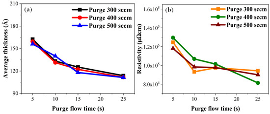 Experimental results: (a) average thickness and (b) resistivity of TiN along the purge gas flow rate.