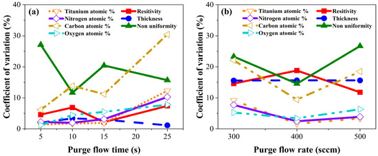 We summarized theoretical and experimental results employing a coefficient of variation. Coefficient variation was obtained by dividing the standard deviation by the mean. Figure 12 illustrates the coefficient of variations of resistivity, thickness, non-uniformity, and atomic percentages of TiN concerning purge gas flow rate and purge gas flow time. Figure 12a shows the coefficient of variation as a function of the purge gas flow rate at each purge gas flow time condition. From this graph, the effect of the purge gas flow rate on the film properties of TiN was determined. The change in purge gas flow rate caused the largest change in non-uniformity and carbon content in the film, while other film properties had a coefficient of variation within 10%, indicating that these properties were not significantly changed by the purge gas flow rate. Furthermore, when the purge gas flow time was 25 s, changes in the purge gas flow rate led to significant variations in the atomic percentages of Ti, N, and notably, C. Figure 12b shows the coefficient of variation as a function of purge gas flow time at each purge gas flow rate condition. The characteristics that showed the largest variation with the change in purge gas flow time were non-uniformity, resistivity, carbon atomic percentages, and thickness. The coefficient of variation of thickness at purge gas flow time did not change, while the atomic percentages of titanium, nitrogen, and oxygen varied within 10%.