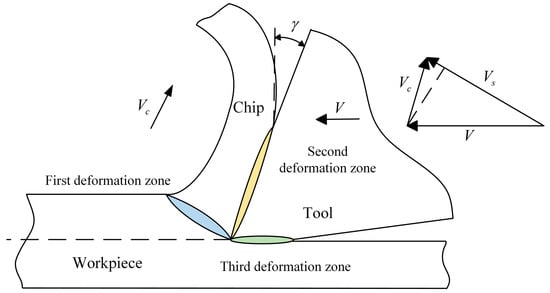 From Figure 1, it can be seen that the metal cutting deformation zone can be divided into the first deformation zone, the second deformation zone, and the third deformation zone. The first deformation zone is the main deformation zone, and its main energy consumption is plastic deformation energy. The second deformation zone occurs in the chip and workpiece contact area, and its main energy consumption is the rake face friction energy. The third deformation zone occurs in the tool and workpiece contact area, and its main energy consumption is the flank face friction energy. Therefore, the energy consumption in the cutting process mainly consists of the following three parts: plastic deformation energy, rake face friction energy, and flank face friction energy. Energy consumption is an integral of power over time.