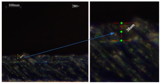 Three levels of tool wear were achieved by selecting three cutting tools with different levels of flank face wear. The width of the flank face wear VB of the three cutting tools is shown in Figure 9, Figure 10 and Figure 11. For more details on tool wear, please refer to the work of Özbek []. The values of each level of the cutting parameters used specifically for the experiment are shown in Table A1. The cutting parameters were brought into the cutting power model to solve for the predicted values of cutting power, and the results of the measured cutting power are shown in Table A2.