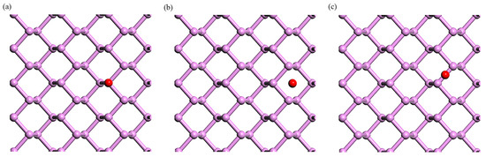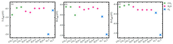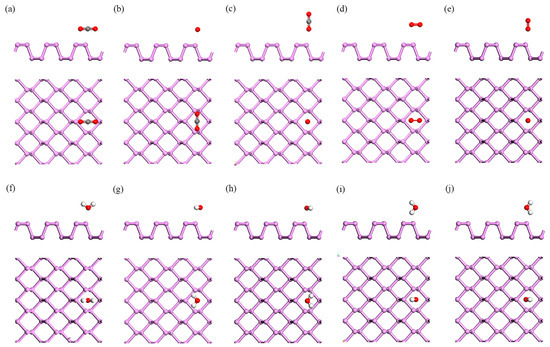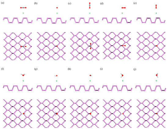 Taking the H-position as an example, Figure 3a–c indicate that CO2 can exist along three directions, Figure 3d,e indicate that O2 can contain two directions, and Figure 3f–j show that H2O presents five model structures, with a total of 30 structural adsorption models. The initial adsorption distance of all the above models is set to be 2.50 Å.