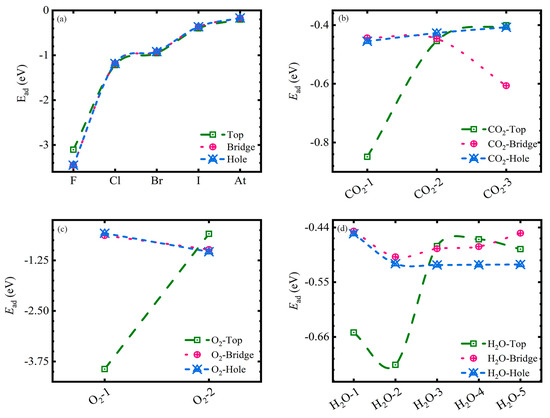 The adsorption energy for (a) halogen atom; (b) CO2 molecule (three directions); (c) O2 molecule (two directions); and (d) H2O molecule (five directions) adsorbed at T-, B-, and H-sites of BP, respectively.
