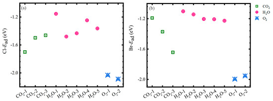 Scatterplot of adsorption energy for gas adsorption decorated by (a) Cl atom, (b) Br atom on BP at T-sites.