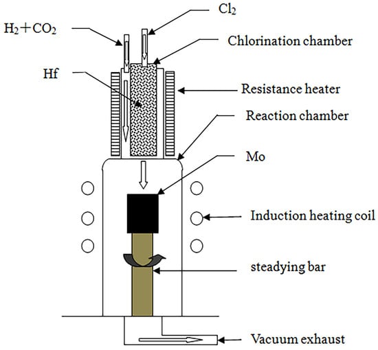 - Chlorination chamber: A 65 mm diameter quartz tube was selected as the chlorination chamber, wherein Hf was heated using a self-assembled resistance furnace, and its temperature was measured with a platinum–rhodium alloy thermocouple. A CY digital display temperature controller was employed to control the temperature in the furnace.