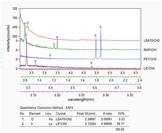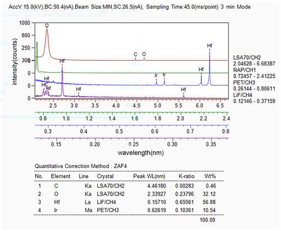 After implementing various improvements, a slow-warming vacuum degassing process was applied before the secondary preparation of HfO2 in the subsequent experiments. Additionally, in preparing the Ir coating, a slow-warming high-vacuum degassing process was also applied before the deposition, aimed at minimizing the adsorbed gas in the pores of HfO2. This approach proved to be considerably effective in addressing the issue in question. The slow-heating method was adopted to prevent the rapid escape of gas, which could otherwise damage the coating during rapid heating. As a result of applying this improved process, the surface of the Ir/HfO2 composite coating appeared relatively flat and smooth, devoid of evident bubbling and cracking, as illustrated in Figure 2c. Figure 4 displays the composition of the Ir/HfO2 composite coating prepared using the improved process.