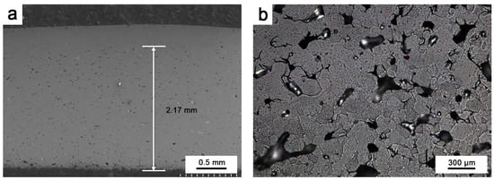 To investigate the protective effect of oxidation on Ir, oxidation tests were performed at 1980 °C for 10 h on round Ir rods treated with hot isostatic pressing and round Ir rods with an HfO2 coating. The oxidation of pure Ir proceeded as follows: After the oxidation test, a sample that was approximately 2–3 mm thick was cut from the end face. It was inlaid so that it could be polished, and the longitudinal section was observed, as shown in Figure 6a. Figure 6b depicts the outermost layer of pure Ir oxidation observed via a metallographic microscope. Figure 7 illustrates the fault morphology of Ir/HfO2 before and after oxidation, respectively.