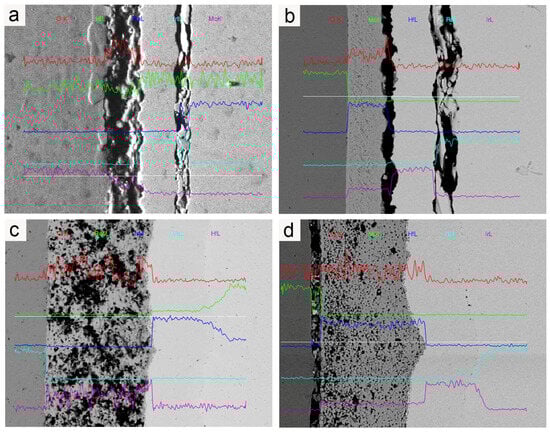 EDS of coating cross-section: (a) element diffusion in the as-deposited composite; (b) element diffusion in the composite after it was subjected to 1400 °C for 2 h; (c) element diffusion in the composite after it was subjected to 1600 °C for 2 h; (d) element diffusion in the composite after it was subjected to 1800 °C for 2 h.
