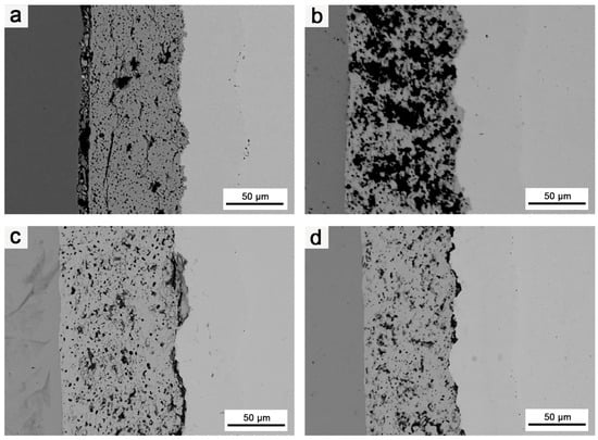 SEM images of coating’s cross-sections: (a) Structure of composite in the deposition state; (b) structure of composite after it was subjected to 1400 °C for 2 h; (c) structure of composite after it was subjected to 1600 °C for 2 h; (d) structure of composite after it was subjected to 1800 °C for 2 h.