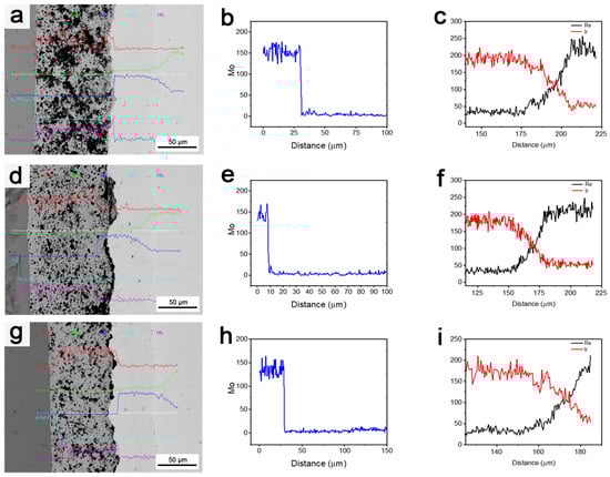 (a–c) Element diffusion in the composite after it was subjected to 1800 °C for 3 h; (d–f) element diffusion in the composite after it was subjected to 1800 °C for 4 h; (g–i) element diffusion in the composite after it was subjected to 1800 °C for 5 h.