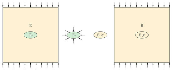 Eshelby proposed that if a certain region within an isotropic elastic solid is retained, after removing the surrounding material, the region will spontaneously undergo a specified uniform deformation [19]. Due to the presence of surrounding materials, there will be stress fields both inside and outside the area. At this point, it is assumed that the elliptical region in an infinite medium has different mechanical parameters from the rest of the material, as shown in Figure 1 and Figure 2. The existence of this non-uniformity interferes with the uniform stress field applied at a long distance. This method for dealing with elastic isotropic inclusions embedded in an infinite elastic matrix is called the Eshelby method [20].