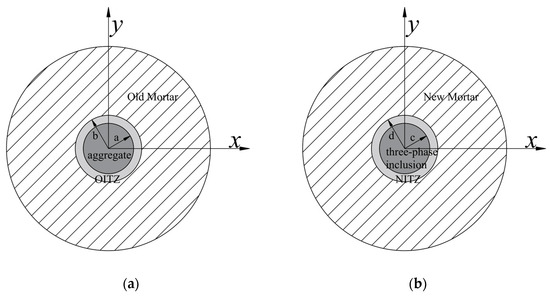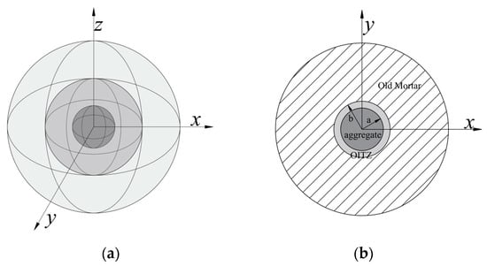 ITZ is an indispensable part of the research on the mechanical properties of concrete, but its volume proportion is extremely small. If ITZ and the aggregates are regarded as matrix and inclusions, the prerequisite condition that the inclusion content envisioned by the inclusion theory is much smaller than that of the matrix itself will be destroyed. Therefore, these problems cannot be solved through the “Dilution method” anymore. When the observation is not limited to a simple combination of aggregates and ITZ, it is found that mortar as a large matrix envelops both. By referring to Christensen’s three-phase sphere model [21], this research combines OM, OITZ, and aggregate in the form of three-phase composites. It is assumed that the three-phase sphere does not interact with other parts of the matrix, as shown in Figure 3a, the mortar serves as the peripheral effective medium, the ITZ serves as the matrix as a uniform spherical shell, and the aggregate is considered as a spherical inclusion. All of them are isotropic homogeneous materials. To align with RC, we chose to do theoretical calculations using a two-dimensional model as shown in Figure 3b.