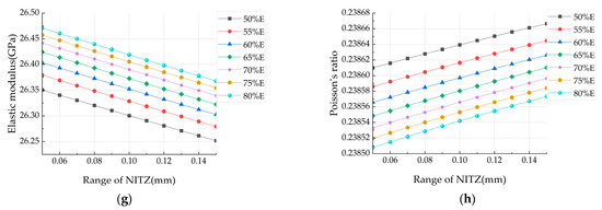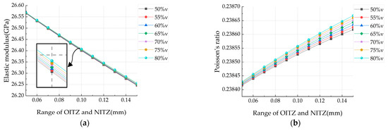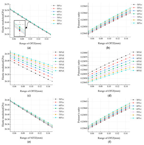 Figure 7e–h provide a detailed chart showing the individual changes in OITZ thickness when NITZ is determined to be 0.1 mm. As shown in the figure, the increase in Poisson’s ratio under different reduction rates has the same effect on the overall mechanical properties of the material as before, which is a decrease in elastic modulus and an increase in Poisson’s ratio. At the same time, it can be found that for a single change in Poisson’s ratio, the change in NITZ thickness only has a minimal impact on the overall elastic modulus and Poisson’s ratio, and is not as significant as the impact of OITZ on the overall structure, and there will be no significant fluctuations. In this research, it is generally believed that NITZ forms at the contact interface between new and old materials, which often have good structural integrity and fewer pores. Therefore, their interface transition zone is relatively new and their performance is more uniform. The material properties of NITZ, located between NM and recycled aggregate, are closer to that of new mortar as the main matrix material. The compatibility between NITZ and the main material is higher, and the stress distribution at the interface is more uniform, avoiding obvious stress concentration. Therefore, in terms of mechanical properties, the impact of NITZ on the overall material performance is relatively small. From Figure 7g,h, it can be seen that although there are similar numerical changes as before, the impact of changes in the overall elastic modulus of NITZ under different reduction rates on the overall elastic modulus and Poisson’s ratio is minimal. As the thickness increases, the increase in numerical elastic modulus and Poisson’s ratio is more significant within a very small range, indicating that when the material is relatively compatible, the overall mechanical properties of the material will be more stable.