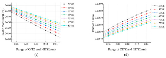 Figure 7a–d provide a detailed chart showing the individual changes in OITZ thickness when NITZ is determined to be 0.1 mm. Comparing Figure 7a–d, the information conveyed by the two figures is basically similar. From specific data analysis, when the elastic modulus decreases, the Poisson’s ratio still shows an upward trend, which is consistent with the data obtained earlier. Research has shown that there is no direct relationship between elastic modulus and Poisson’s ratio at this scale. The elastic modulus is gradually reduced as the thickness of ITZ increases, and then increases in another aspect due to the continuous increase of the reduction coefficient. This validates the crucial assumption of the geometric characteristics of ITZ in theoretical research. Under the condition of only adjusting the thickness of OITZ, the proportion of interface inclusions increases compared to when adjusting both ITZs simultaneously, and the discontinuity phenomenon is more significant. According to the theory of multiphase inclusions, this increased interface discontinuity has a negative impact on the overall mechanical properties of the material. Due to the weaker material properties in the interface region compared to the main material, an increase in interface thickness means an increase in the proportion of weak regions. The increase in thickness of a single interface leads to the phenomenon of stress concentration in this area, weakening the load-bearing capacity and deformation capacity of the structure, thereby causing a decline in the macroscopic mechanical properties. Especially when adjusting the OITZ separately, the discontinuity of the mesoscale becomes particularly evident, which causes the overall mechanical response of the material to be misaligned.