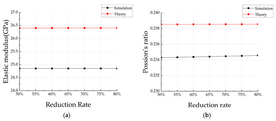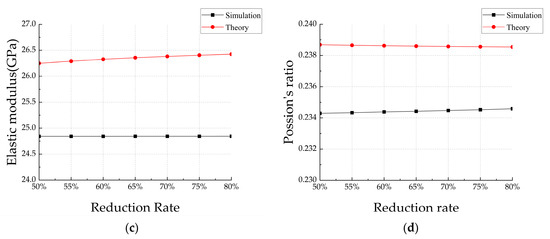 Effects of ITZs on overall mechanical properties of normal concrete at different reduction rates. (a) Effects of different ITZs thicknesses on the elastic modulus. (b) Effects of different ITZs thicknesses on the Poisson’s ratio. (c) Effects of different ITZs thicknesses on the elastic modulus. (d) Effects of different ITZs thicknesses on the Poisson’s ratio.