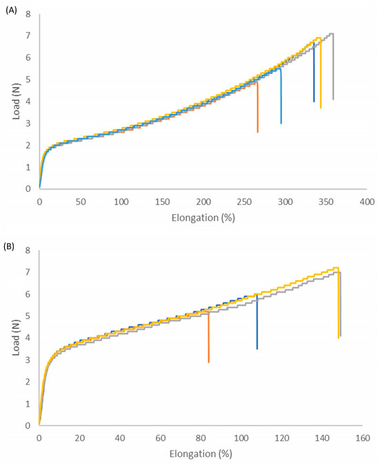 Tensile curves of trigger-degradable PU films without crosslinker (A) and with crosslinker (B). The different colors represent each a tensile measurement.