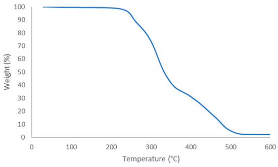 The thermal degradation of the trigger degradable PU was characterized by TGA in air up to 600 °C (Figure 4). The PU started to degrade above 200 °C, but at the end of the analysis, almost no residue was found. Degradation of PU occurred in three steps: Initial degradation is attributed to dissociation of the urethane segments, while second thermal degradation is associated with degradation of linear hydrocarbon chains and ester groups. Finally, C=C bonds were cleaved in the last degradation step [29,30,31].