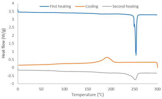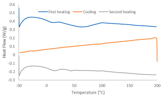 The thermal properties of the developed PU were further characterized by DSC (Figure 5). Glass transition temperature was situated approximately at 1 °C, while melting point during the second heating was at 44 °C. Crystallization was observed at −13 °C.