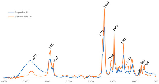 IR spectra of trigger-degradable PU before (debondable PU) and after (degraded PU) immersion in TBAF solution.