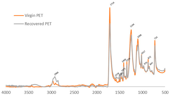 Table 4 displays the glass transition temperature (Tg), melting temperature (Tm), and crystallinity degree (Xc), obtained via DSC, of virgin and recovered PET fabric. The virgin and recovered polyester had a slightly different Tg and Tm (Figure 11 and Figure 12). A small decrease in Xc, Tg, and Tm was noticed for the recovered fabric. However, the increased crystallinity had no significant influence on the mechanical properties since elongation and tensile strength of recovered and original PET were similar.
