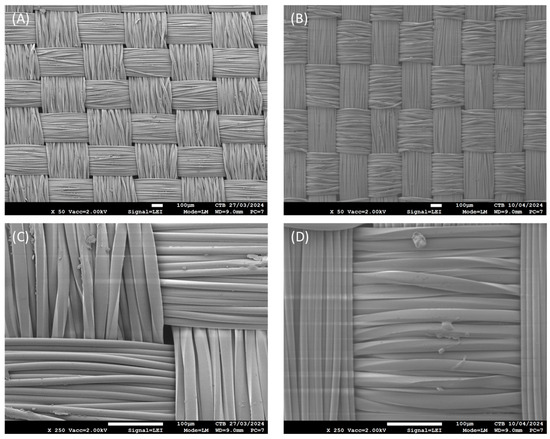 SEM images of virgin PET ((A): magnification of 50 and (C): magnification of 250) and recovered PET fabric ((B): magnification of 50 and (D): magnification of 250).