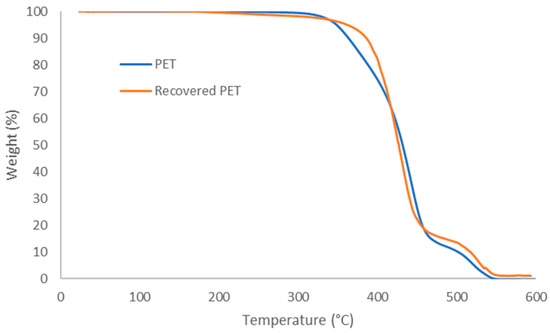TGA analysis of the PET fabric after removing the coating was performed to evaluate possible alternation of the thermal stability of the PET fabric during the degradation test due to degradation of PET or remaining residue. The TGA curves of virgin PET and recovered PET are shown in Figure 10. Both recovered and virgin PET exhibited a similar two-step thermal degradation. The biggest weight decrease appeared in the temperature range of 300 to 450 °C. During the first degradation step, ester links are broken. The thermal degradation leads to cyclic oligomers due to intramolecular backbiting and hydrogen transfer. Terephthalic acid, benzoic acid, and vinyl benzoate are produced amongst other compounds. Further degradation of aromatic cyclic compounds occurred during the second degradation [35,36]. Recycled PET tends to decompose at higher temperatures in comparison to virgin material. Indeed, the onset temperature, at 5% mass loss, changed from 348 to 362 °C.