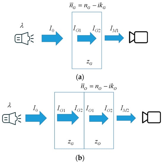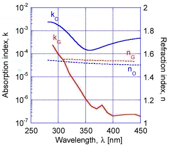 Here, zO is the thickness of the organic layer, IO1 and IO2 are the intensities of light in the organic layer at the front and the back surfaces, IM2 is the intensity of light measured after passing through the bilayer, TO is the absorption coefficient of the organic layer, TOG is the transmittance at the interface of glass and the organic layer, and TO is the transmittance at the surface of the organic layer, respectively. From the refractive index in Figure 1 and Equation (7), the effective absorption coefficient, TO, was 0.08 μm−1 for a wavelength of 300 ± 5 nm.