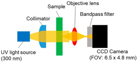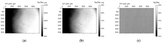 Figure 3 shows the schematic of the light extinction measurement system. The setup consists of a 300 nm wavelength light source (M300L4, THORLABS, Newton, NJ, USA), a collimator for producing parallel light, a 5× objective lens, and a CCD camera (pco.ultraviolet, Excelitas, Waltham, MA, USA) with 1392 × 1040 pixels and a 300 ± 5 nm bandpass filter, enabling a measurement range of 4872 × 3640 μm2 with an XY resolution of 3.5 μm. The typical images of the measured intensity of light extinction for a glass substrate, IM1, and an organic layer spin-coated glass substrate at 1500 rpm, IM2, are shown in Figure 4a and Figure 4b, respectively. Figure 4c displays the intensity ratio of IM2/IM1. In this figure, all the light intensities are relative values to the average intensity of the bare glass substrate, IM1,avg, over the measured area. Figure 5 shows the root mean squared error (RMSE) between the measurements. It can be clearly seen that the RMSE could be reduced to the level of several nanometers by pixel binning and image overlaying. By overlaying 16 images for each measurement, the current light extinction method was able to achieve an RMSE of less than 30 nm (0.75%) without pixel binning.