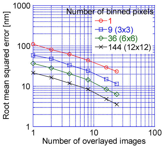 Variation in the root mean squared error of the light extinction-based thickness measurements as a function of pixel binning and image overlay.