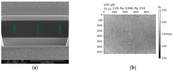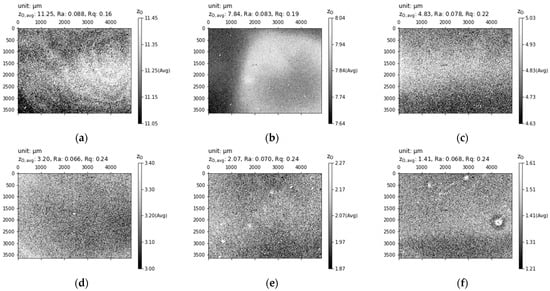 Figure 8 displays thickness distribution images of spin-coated organic layers at various spin speeds in the central region of the substrate. The images are visually represented on a gray scale ranging from −0.4 μm to +0.4 μm, centered on the average thickness. From 1,447,680 data points of the 4872 × 3640 μm2 area obtained from each measurement, the arithmetic average, Ra, and root mean square average, Rq, of the roughness profiles were also calculated using Equations (12) and (13), respectively.