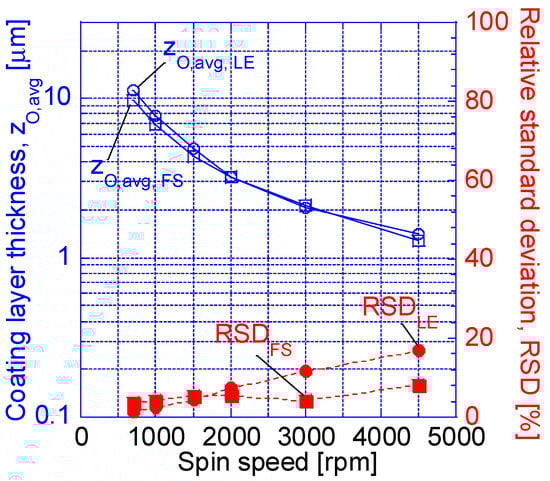 Variation in average thickness, zO,avg, and relative standard deviation, RSD, of the spin-coated organic layer as a function of spin speed, measured by FIB-SEM (FS) and light extinction (LE) methods.