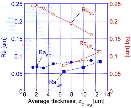 Variation in arithmetic average, Ra, and root mean square average, Rq, of surface roughness for spin-coated (SC) and inkjet-printed (IJP) organic layers, as a function of average thickness, zO,avg.