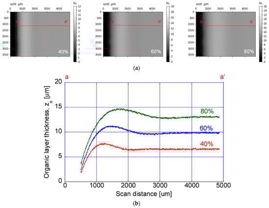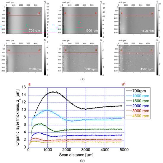 Figure 11 shows the thickness distribution of the spin-coated organic layer near the edge of the substrate for various spin speeds ranging from 700 rpm to 4500 rpm. Figure 11a shows thickness distribution images measured by the light extinction method, where the edges of the layers are located on the left side of the images, and the center direction is on the right side of the images. In the images, the thickness of the bright area is higher, and the median brightness level was adjusted to the average thickness, zO,avg, of each layer. Figure 11b shows the thickness profiles along the a-a’ cross-sections of the images in Figure 11a. As shown in Figure 11, the light extinction image method successfully measured thickness distributions that vary significantly near the edge. This method clearly captured the typical edge beads produced during spin coating [25,26]. In this figure, the height and width of the edge bead decrease with spin speed.
