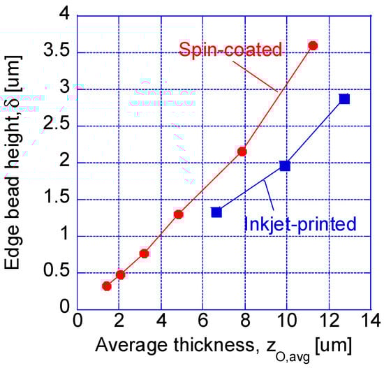 Figure 13 compares the change in edge bead height according to the average layer thickness, zO,avg, for two coating techniques: spin coating and inkjet printing. Here, the height of the edge bead, δ, was defined as follows: