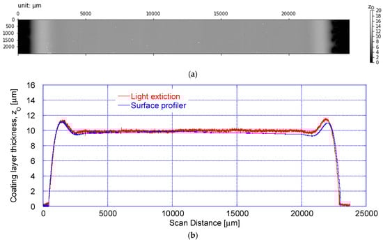 Finally, Figure 14 shows the overall distribution along the printing direction for a printing density of 60%, which was created by connecting successively measured light extinction images. In this figure, the cross-sectional profile measured by the light extinction was also compared to that measured by a surface profiler (P-7, KLA-Tencor, Milpitas, CA, USA), showing that the two results are in good agreement.