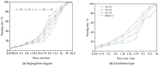 In addition, to analyze the texture properties of asphalt pavement with various segregation degrees, the rutting plate of AC-20 asphalt mixture with five standard segregation degrees such as fine aggregate segregation (FL), no segregation (N), light segregation (L), moderate segregation (M), and high segregation (H) were designed [,], with aggregate gradation curves as shown in Figure 1a. In addition, rutting plate specimens of asphalt mixtures with gradations of AC-13, AC-16, AC-20, and SMA-13 were formed to explore the influence of the gradation type on the texture structure of the asphalt pavement, and the aggregate gradation curves are shown in Figure 1b.