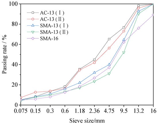Moreover, to study the attenuation characteristics of skidding resistance of asphalt pavement and further verify the feasibility of proposed evaluation index based on texture parameters, the rutting plate specimens of AC-13 (Ⅰ), AC-13 (Ⅱ), SMA-13 (Ⅰ), SMA-13 (Ⅱ), and SMA-16 asphalt mixture were formed, which aggregate gradation curves as shown in Figure 2. The optimum asphalt content of all mixtures was determined using the Marshall method, as shown in Table 2. The performance of the asphalt mixture satisfied the requirements of the related specifications [].