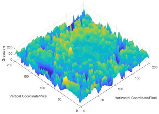 Based on the principle of shape from shading (SFS), the two-dimensional images were reconstructed according to the corresponding algorithm to obtain the three-dimensional morphology of the texture structure []. The preprocessed gray image was analyzed using MATLAB to obtain the corresponding coordinates and gray levels, and a three-dimensional texture model was constructed, as shown in Figure 5.