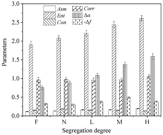As shown in Figure 7, the texture parameters of the asphalt mixtures with different segregation levels changed to varying degrees when compared to the non-segregated mixture. Specifically, with an increase in the degree of coarse segregation, the energy, entropy, and multifractal spectrum width gradually increased, whereas the inertial moment gradually declined. The variation ranges of multifractal spectrum difference Δf first increased and subsequently decreased, and the change trend of the correlation was not evident. When fine-aggregate segregation occurs in an asphalt mixture, various parameters decrease to different degrees. Among several parameters of texture structure, the multifractal spectrum width Δα is sensitive to the change of segregation degree of coarse aggregate, and the corresponding variation range is the largest. The increase in the range of the multifractal spectrum width of the asphalt mixture with the segregation level H reaches 80.8%. The variation range of the correlation among the specimens with various degrees of segregation is typically 3%. After the fine aggregate segregation of the asphalt mixture, the reduction ranges of the inertial moment and multifractal spectrum width are larger, whereas the change ranges of the correlation and multifractal spectrum difference are smaller.