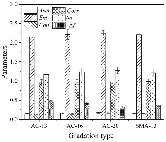 In addition to the degree of segregation, the gradation type is also an important factor affecting the textural properties of asphalt pavements. Rutting specimens with four different gradations of AC-13, AC-16, AC-20, and SMA-13 were prepared. Energy, entropy, inertial moment, correlation, multifractal spectrum width, and spectral difference parameters were calculated. The results are shown in Figure 8.