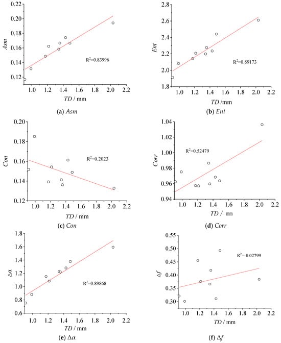 Based on the gray-level co-occurrence matrix and multi-fractal theory, the texture parameters of the plate specimens of the AC-20 asphalt mixture with five segregation degrees and four gradation types of AC-13, AC-16, AC-20, and SMA-13 were calculated. The TD of the corresponding rutting specimens was measured using the sand patch method. The texture parameters used in the correlation analysis are the mean values of four parallel samples. The correlation between the texture parameters and TD of various asphalt mixtures are shown in Figure 9.