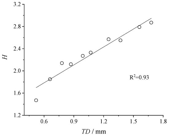 To verify the feasibility and reliability of the comprehensive evaluation index of skidding resistance based on laboratory test results, 10 points were randomly selected in areas with different degrees of segregation on Xiaguang Avenue and Fuxing Avenue of Fuyang City, and texture images of the pavement surface were acquired and processed. Then, the evaluation index H was calculated by MATLAB, and the texture depth TD of the corresponding area was measured using the sand patch method. The correlation between the comprehensive evaluation index H and the texture depth TD of the asphalt pavement is shown in Figure 10.