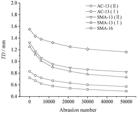 As shown in Figure 11 and Figure 12, with an increase in the abrasion number, the changing trend of the comprehensive evaluation index H was consistent with the traditional index of texture depth TD, which further confirms that the comprehensive evaluation index H can be selected to analyze the attenuation characteristics of the skidding resistance of asphalt pavements. Among these, the evaluation index of H and the texture depth of the asphalt mixture with five gradation types all gradually declined as the accelerated abrasion number increased, and the anti-skidding attenuation trend showed apparent regularity. Indeed, the attenuation characteristics of the skidding resistance of the asphalt mixture could be divided into three stages with the increase of accelerated abrasion number, the rapid decline, transition, and relatively stable stages. Specifically, the accelerated abrasion number of 0–12,000 times belonged to the rapid decline stage, the abrasion number of 12,000–30,000 times corresponded to the transition stage, and the abrasion number of more than 30,000 times belonged to the relatively stable stage. This is mainly because the aggregate on the surface of the rutting plate was wrapped by asphalt mortar, which was significantly worn in the early stages of accelerated abrasion, and the skidding resistance index decreased rapidly. Aggregates gradually appeared when the asphalt mortar was worn off. At this time, the skidding resistance of the asphalt pavement was mainly borne by the aggregates, and the decay process was relatively gentle.