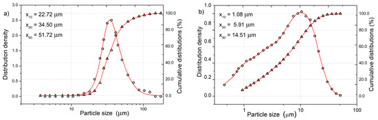 Particle size distribution of powder, showing (o) distribution density and (Δ) cumulative distribution (%): (a) WC-12Co Nanox; (b) Fe3O4 Nanox.
