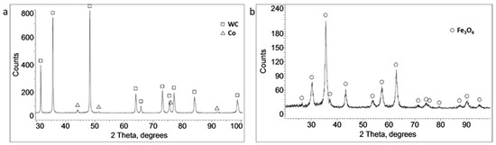 X-ray diffraction pattern of powder: (a) WC-12Co Nanox; (b) Fe3O4 Nanox.