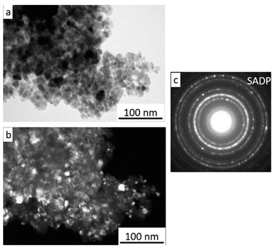 Nanostructure of Fe3O4 Nanox powder: (a) in the bright field (BF), (b) in the dark field (DF), and (c) electron diffraction (SADP).