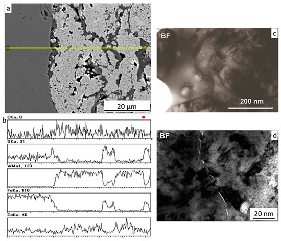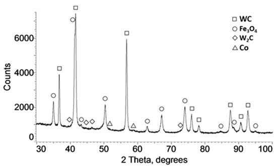 The linear analysis of the microstructure of the nanocomposite coating confirmed the presence of ingredients contained in the feedstock (Figure 7a,b). The high iron content of the substrate drops sharply in the coating where an increase in tungsten and cobalt is seen. The increase in iron presence in the coating coincides with increased oxygen counts, confirming the presence of Fe3O4 in this area. Figure 7c shows the nanostructured WC grains in the deposited nanocomposite coating. The nanostructured Fe3O4 was also preserved during HVOF process. The very small spherical Fe3O4 nanograins present in the starting powder were also retained in the deposited coating (Figure 7d). The analysis of phase composition of the nanostructured composite coating confirmed the presence of all components in the sprayed mixture (Figure 8).