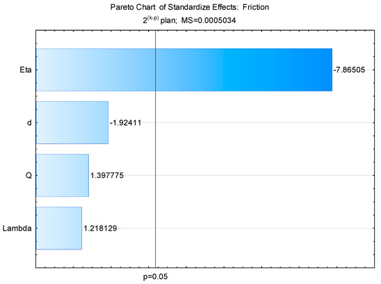 The first parameter subjected to the study is friction. The obtained results were subjected to ANOVA, indicating the input parameter with the highest significance. The analysis showed a statistically significant effect of η on the friction value. The function F took the value of 61.8, with a p-value of 0.004. Other input parameters do not have such an influence, as the function F takes values below 1 and the p-value is significantly greater than 0.05. It was found that the remaining parameters do not have a statistically significant impact on the measured property. The actual impact of these parameters requires further investigation under different experimental conditions. Standardized results were depicted on the Pareto diagram (Figure 9) and profiles of approximated values (Figure 10).