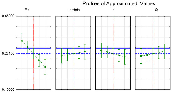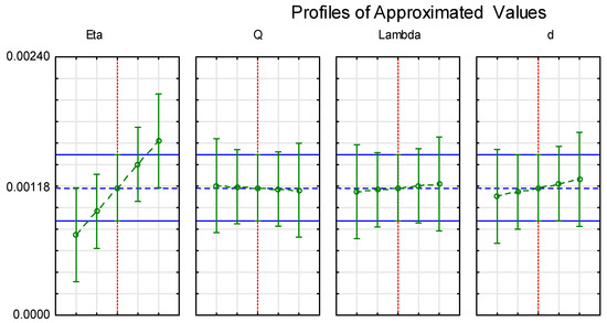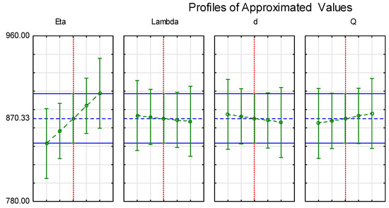 In the first-order two-level programs, the input factors are normalized to two levels, upper (1) and lower (−1), and the central values are calculated as the arithmetic mean of the input factor. The significance of the coefficients was assessed with the use of ANOVA, F and p tests. The quality of the obtained results is presented in Pareto diagrams or profiles of approximated values and utility.