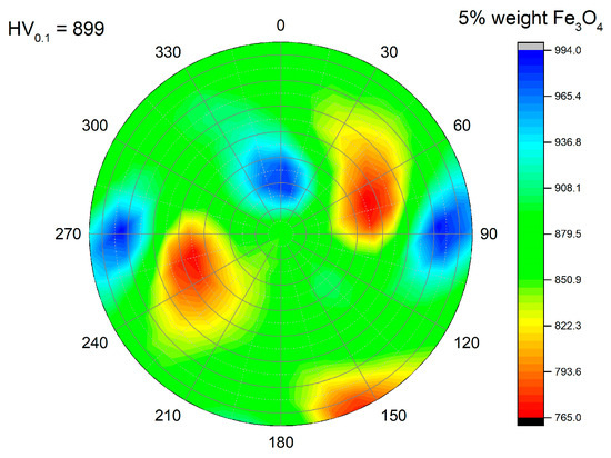 A statistical test for microhardness, HV0.1, was conducted for two samples, considering 5 wt.% and 15 wt.% of Fe3O4 admixture, and the mean values are shown in Table 2. Based on the measurement points, hardness values were compiled to create maps. These maps are presented in Figure 11 and Figure 12.