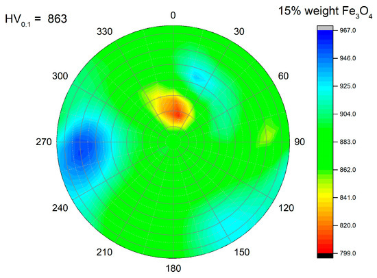 Distribution of microhardness obtained for 15 wt.% Fe3O4 content.